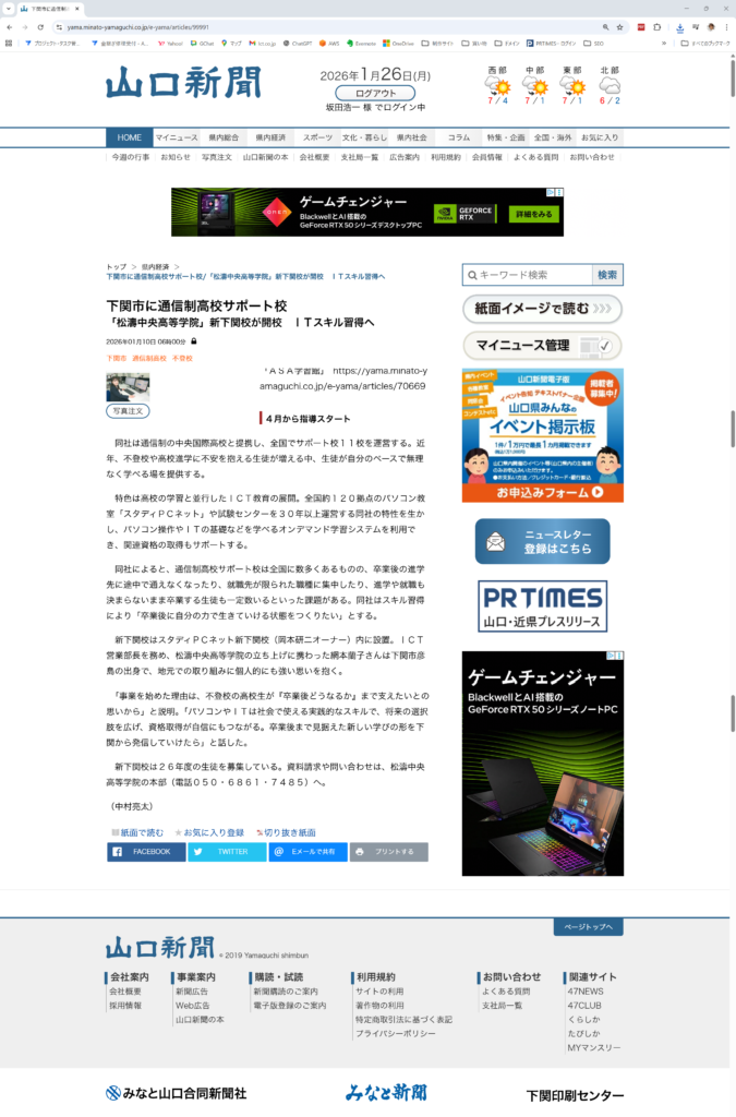記事では、下関市に新たに開校した通信制高校サポート校として、「生徒一人ひとりが、自分のペースで学びながら、高校卒業資格と将来につながる力を身につけられる場」である点をご紹介いただいています。