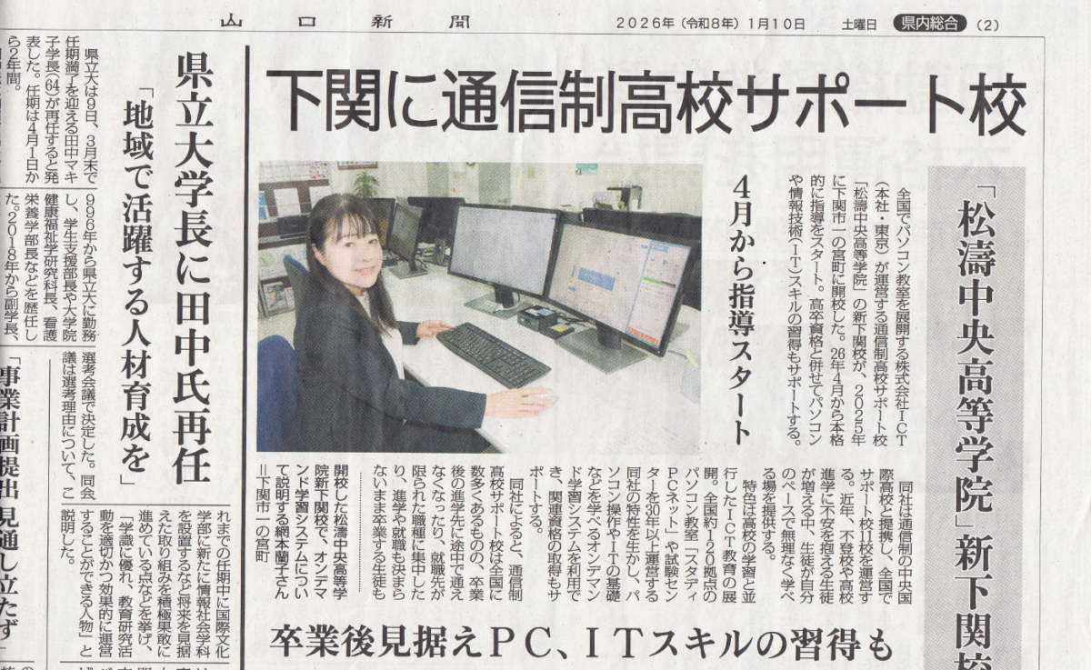 全国でパソコン教室を展開する株式会社ICT(本社・東京)が運営する通信制高校サポート校「松濤中央高等学院」の新下関校が、2025年に山口県下関市一の宮町に開校した。26年4月から本格的に指導をスタート。高卒資格と併せてパソコンや情報技術(IT)スキルの習得もサポートする。